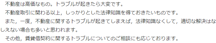 大変申し訳ございませんが、担当弁護士の予定が一杯のため、現在、企業の方の不動産トラブルについてのご相談はお受けすることができません。