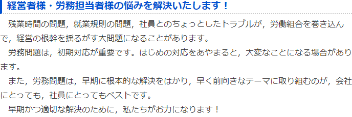 現在、使用者側の労働問題につきましては、労災事故についてのご相談のみ承っております。その他の使用者側の労働問題につきましては、大変申し訳ございませんが、担当弁護士の予定が一杯のため、ご相談をお受けすることができません。