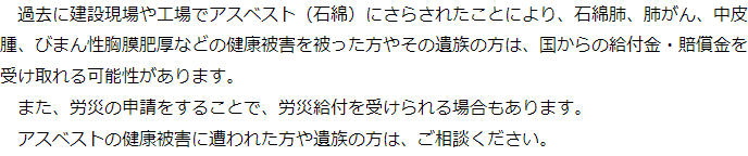 大変申し訳ございませんが、担当弁護士の予定が一杯のため、現在、アスベスト被害対応についてのご相談はお受けすることができません。